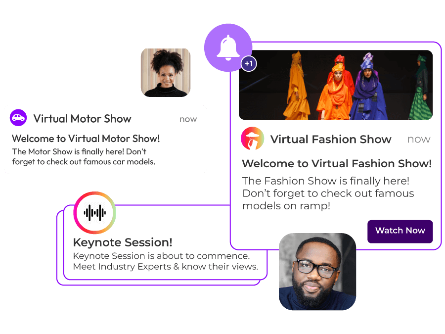Notifications help streamline any immediate update, announcement, change during the LIVE virtual event with the audience. The host gets the functionality to control the notifications throughout the event.