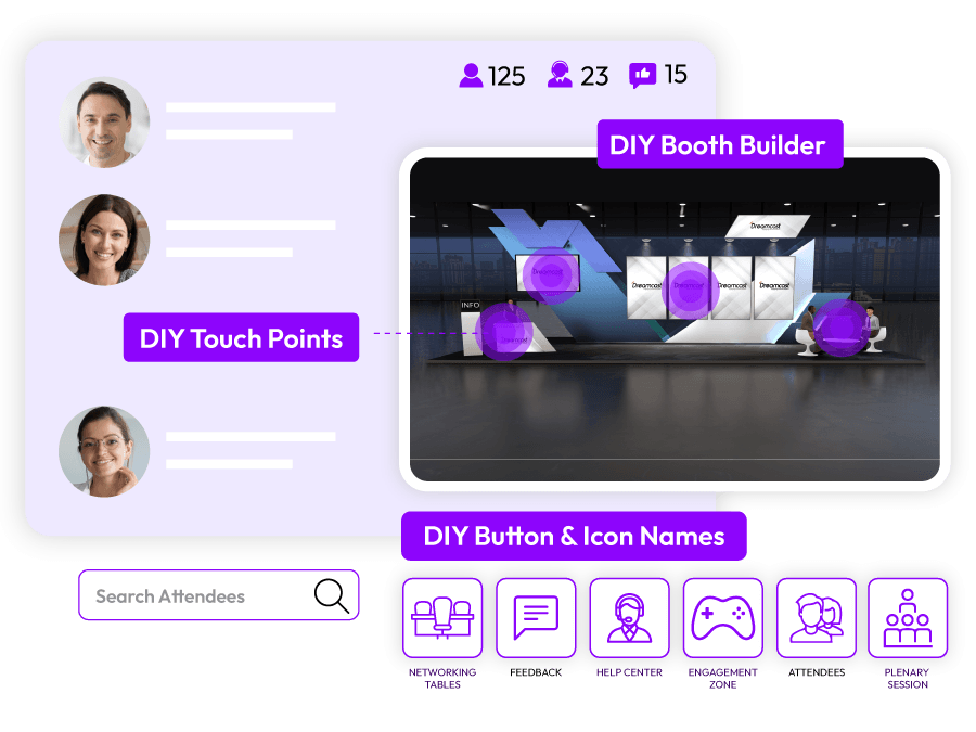 - DIY booth builder is redefining exhibition experiences. It allows hosts /exhibitors to build a virtual exhibition booth as per their likes & wants. Right from color, text, tabs, banners etc.