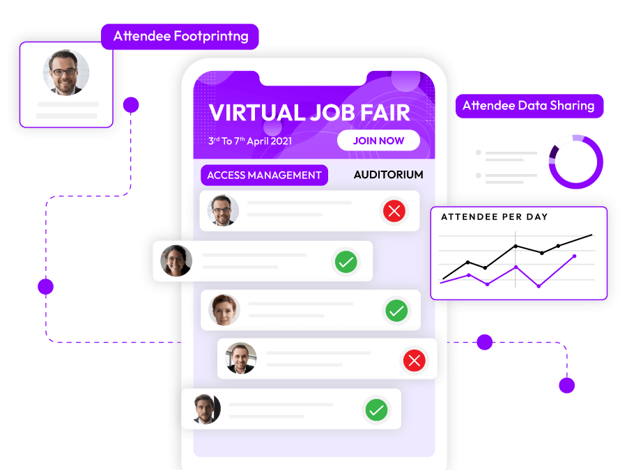 - Attendee Footprinting is for keeping a track of the user journey opted by each virtual attendee. This feature can be utilised to analyse which area is the most as well as least visited during a virtual fair.