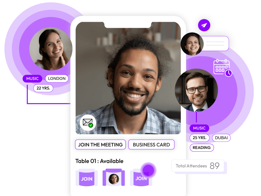 - Networking Tables Experience 1:1 & group networking as this feature makes sure all the attendees can access inbuilt audio as well as video calls to boost up the communication just like any in-person event & feel connected even with the distance.